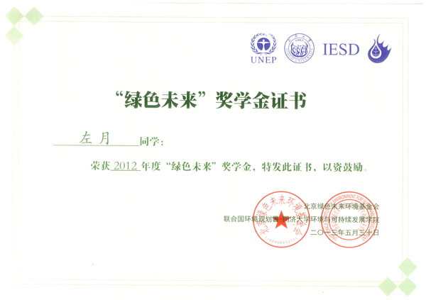 近日,从“国际学生环境与可持续发展大会”上传来喜讯,beat365官网资源环境学院学生左月同学获得“2012绿色未来”奖。由联合国环境规划署、同济大学联合举办的“国际学生环境与可持续发展大会” 于6月5-8日在同济大学召开,beat365官网资源环境学院学生左月同学作为全国20名“2012绿色未来”奖学金获得者代表赴上海参会。