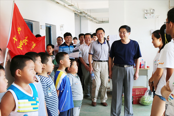 何小祥书记、闵永新副院长一行首先了解了团队工作总体安排和留守儿童暑期夏令营的近期活动开展情况,然后悉心观看了经典天天读、英语口语、美术、手工制作等“七彩课堂”兴趣课程,赏析了教育主题墙绘作品,对志愿者们的用心教育和孩子们的精彩表现赞不绝口;接着,细细察看了团队队员的住宿场地和用餐情况。“吃得苦中苦,方为人上人。只有在艰苦的环境下才能愈加激发一个人的潜能。”何书记在了解了团队的工作和生活情况后,对志愿者们亲切地说道。