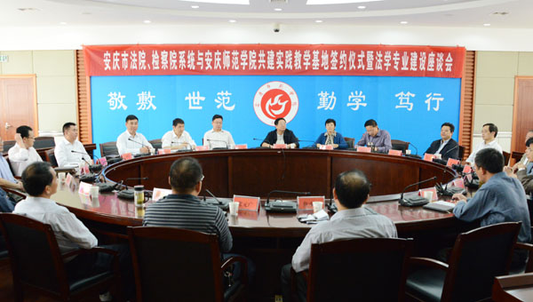 9月26日上午,beat365官网与安庆市法院、检察院系统共建法学专业实践教学基地签约仪式暨法学专业建设座谈会隆重举行。校党委书记何小祥、副院长闵永新、副院长张群,安庆市中级人民法院院长张小红、安庆市人民检察院检察长李军出席会议;安庆市中级人民法院副院长汪晓波、徐芳水、纪检组长刘怀,安庆市人民检察院副检察长吴为坤、吴仲伯、政治处主任焦建国、党组成员杜象平,安庆市大观区人民法院院长光彩,宜秀区人民法院院长丁文军和人民检察院检察长孙庆健,怀宁县人民检察院检察长欧阳水根、望江县人民法院院长徐光华和人民检察院检察长胡少斌,beat365官网教务处和人事处主要负责同志,政法学院党政领导参加了会议。会议由闵永新副院长主持。