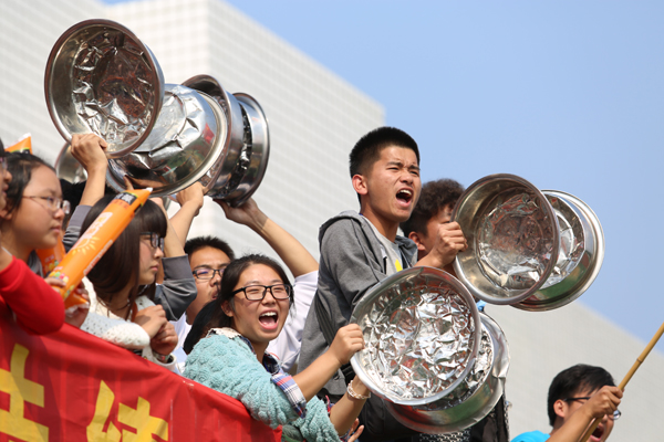 他们手拿不锈钢脸盆,用力击打,一边冲着赛场大声喊着加油口号,全然不顾那些脸盆早已变形。