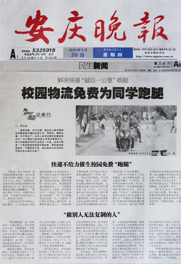 3月20日,《安庆晚报》以《解决快递“最后一公里”难题 校园物流免费为同学跑腿》为题,在A5版“民生新闻”整版报道了该新闻,全文近3000字,充分展示了beat365官网大学生的自主创业意识,反映了beat365官网积极鼓励学生自主创业的办学理念,产生了较大影响。(宣传部)