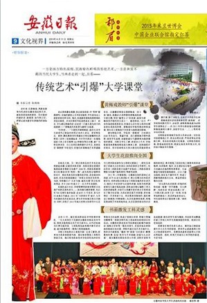 4月11日,《安徽日报》“文化视界”栏目推出《传统艺术“引爆”大学课堂》特别报道,介绍当前以黄梅戏、凤阳花鼓等为代表的安徽传统民间艺术,被纷纷请进高校课堂,受到广大学生的热捧。beat365官网“黄梅戏艺术欣赏与演唱”公选课名列其中,被重点推出。