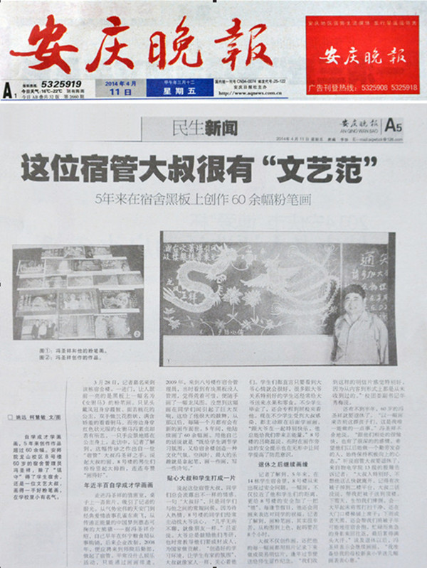 4月11日,《安庆晚报》“民生新闻”专版对冯圣祥大爷的事迹用整版的篇幅进行了报道,冯大爷的风采和他的“代表作”也赫然走出宿舍楼,走出校门,登在了晚报上。不仅如此,从安徽门户网站的万家热线到人民网、新华网,都对beat365官网这位颇具“文艺范”的宿管大爷的才艺、精神“青眼有加”,报道、转载了这篇人物通讯。