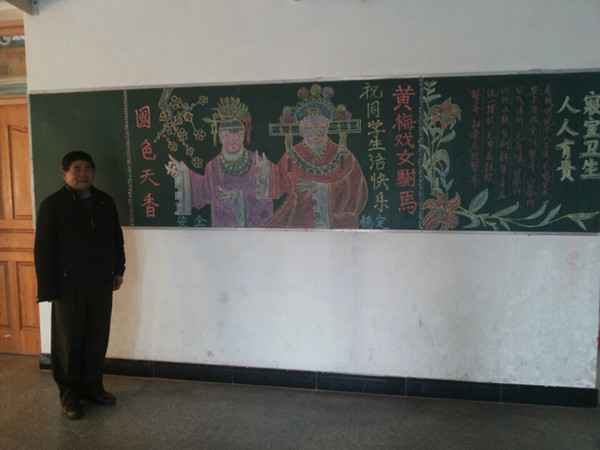 近日,当安庆师范学院的学生一走进该校8号宿舍楼时,纷纷被大厅内黑板上的一幅名为“女驸马”的粉笔画所吸引。只见画中一位头戴凤冠、身披霞帔、面若桃花的公主,双手作兰花指状,满含娇羞地望着驸马,十分传神。令人意想不到的是,这幅精彩的粉笔画竟然出自一位宿管大爷之手。