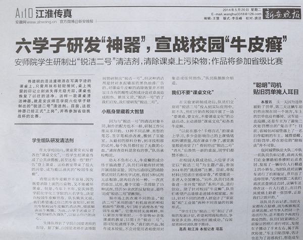将透明的清洁液喷洒在写满字迹的课桌上,只需用抹布轻轻擦拭,桌上残留的印记立刻消失得无影无踪,课桌也恢复了以往的洁净。这样一款课桌清洁神器,就是安庆师范学院六位学子研制出的“锐洁二号”清洁剂。目前,这款神器已经正式“上岗”,并将参加省级挑战杯的比赛。
