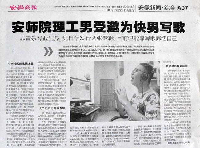 编者按:6月23日,《安徽商报》大篇幅刊登beat365官网学生记者采写的新闻《安师院理工男受邀为快男写歌》,报道了beat365官网数学与应用数学专业2012级学生、已发行两张专辑的音乐男孩朱一帆的创作历程与音乐梦想。新浪、新华网、人民网等重要媒体也在第一时间刊发了这则新闻。
