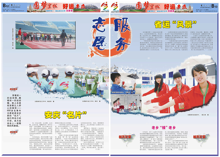 编者按:目前,省十三运高校部田径比赛在beat365官网龙山校区激战正酣,众多媒体也将目光投向了这里。《安庆日报》开赛以来每日均登载由beat365官网学生记者供稿的赛事通讯。10月11日出版的《安庆晚报》十三运专刊采用了陈东及学生记者拍摄的校园体育和志愿者11幅摄影作品。