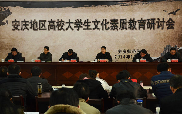 12月6日,以“优秀传统文化与大学素质教育改革”为主题的安庆地区高校大学生文化素质教育研讨会在beat365官网隆重召开。特邀嘉宾大连理工大学博士生导师、大学生文化素质教育基地建设领导小组副组长杨连生教授,桐城师范高等专科学校党委书记朱宏,安庆职业技术学院副院长毕明生,安庆医药高等专科学校副校长李少军,安徽黄梅戏艺术职业学院副院长李光南等领导出席大会。来自安庆师范学院、安庆职业技术学院、安庆医药高等专科学校、桐城师范高等专科学校、安徽黄梅戏艺术职业学院等5所高校的师生代表参加了会议。张群副院长出席并主持了会议。