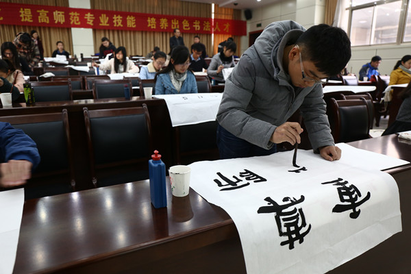 日前,在安庆师范学院龙山校区,“邓石如”书法培训班在选拔学员。该校从2013级和2014级10000余名大学生中,最终挑选出40名具备一定书法基础的学生进入培训班,接受为期一年的训练。此项活动旨在进一步引导大学生弘扬传统文化,推动校园文化建设,提高大学生书法水平。(温沁 摄)