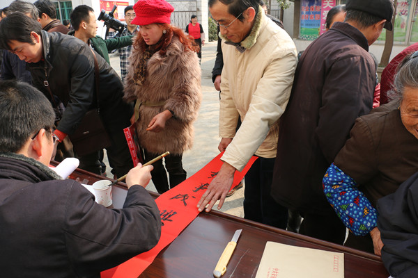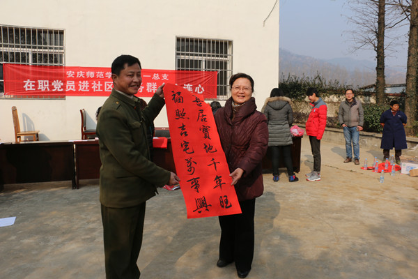 活动现场,10余位书法老师和书法爱好者泼墨挥毫,笔走龙蛇,“马跃庆丰年,羊鸣歌盛世” 、“鸣莺传燕信,策马赴羊年”、“一帆风顺年年好,万事如意步步高”、“吉星高照,五福临门”……一幅幅春联散发着浓浓墨香,洋溢着新年的喜庆气氛,映红了社区群众笑逐颜开的面庞,也传递了党员对社区群众的热情祝福,得到社区群众的交口称赞。一位老大爷说:“这些春联不仅字好,而且句句都是吉祥话,写到我们心里去了。”一位打工回乡的小伙子说:“师院的老师们给我们写春联,感觉与书法家的距离近了,也感觉年味更浓了。”