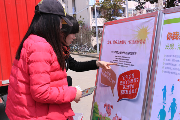 校医院曹必宏副院长说:“防治肺结核的的宣传活动我们校医院每年都会举办,但今年规模最大,今天不仅来了校医院的6名医师,还有市、区疾控中心的8名医师和工作人员。之所以这次活动的规模较大,是因为学校是人群集聚点,进行结核病防治安全教育非常有必要,也很迫切。”