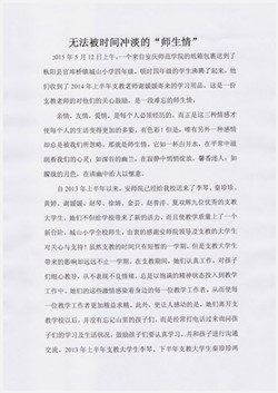 亲情,友情,爱情,是每个人必须经历的,而正是这三种情感才使每个人的生活变得更加的多姿,有色彩!但是,唯有另外一种感情却总是被我们所忽略,那就是师生情。它如一杯白开水,在平常中滋润着我们的心灵;如深谷的幽兰,在寂静中悄悄绽放,馨香迷人;如朦胧的月色,在清幽中给人以惬意。