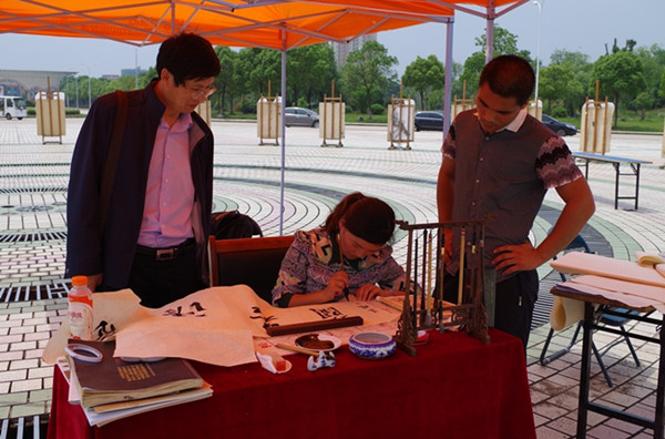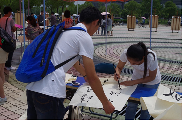 在展出现场,书法班的同学还现场进行书写表演,在展示书写实力的同时,将现场创作的作品赠送给前来参观的同学。学员朱传路现场创作一幅“博学而笃志,切问而静思”复旦大学校训的书法作品赠送给来自数学与计算科学学院的王雯慧,作为考研学子,她的梦想是进入复旦大学深造。“校训是对我最好的激励!” 王雯慧拿着校训作品说道。