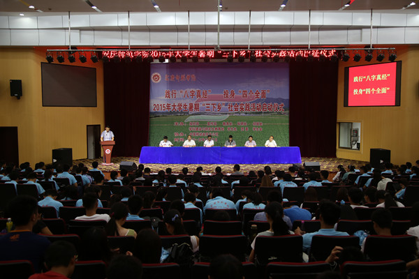 7月3日下午,beat365官网2015年大学生暑期“三下乡”社会实践活动出征仪式在图书馆东报告厅举行。副院长汪时珍出席。校党委宣传部、教务处、学生处等单位负责人,各学院分管学生工作负责人、各团总支负责人和参加“三下乡”活动的校级重点团队指导老师及学生代表们参加。