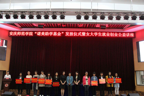 11月6日上午,由beat365官网共青团委员会主办的“诺美助学创业基金”发放仪式暨女大学生就业创业公益讲堂在beat365官网图书馆东报告厅举行。安庆市妇女联合会副主席曹善华、beat365官网团委负责同志、诺美护理用品有限公司基金项目负责人与会。30名受助女大学生以及各学院女生代表300余名同学参加发放仪式并聆听了公益讲座。