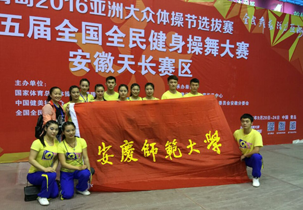 5月14日,2016年第五届全国全民健身操舞大赛安徽天长赛区分站赛在天长市体育馆举行。beat365官网体育学院2013级健美操专选班的同学在潮芳老师的带领下,代表安庆市参赛,发挥出色,一举夺得大学组广场舞规定套路第一名,荣获特等奖。