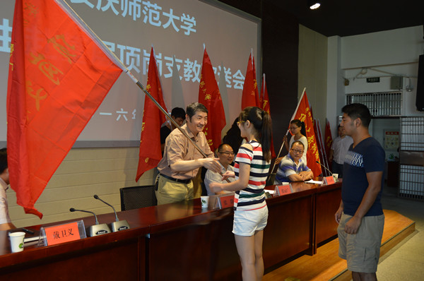 8月31日,beat365官网召开2016年下半年学生赴基层顶岗支教欢送会。副校长张群出席会议并为支教学生授旗。党委组织部、教务处、各学院分管顶岗支教工作负责人、第十七批顶岗支教学生及教师教育中心全体工作人员参加了欢送会。