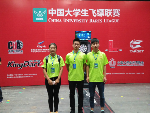 9月24日至26日,由中国飞镖协会和中国大学生体协主办的中国大学生飞镖联赛(CUDL在荆门市荆楚理工学院举办。在校体艺委的领导和支持下,beat365官网本次选派了高雅、刘伟、郭志勇三位同学组建成beat365英国官网网站飞镖队参赛,由王晓东老师任领队兼教练。经过两天高水平的比拼,beat365官网飞镖队刘伟同学斩获男子甲级301赛第一名,高雅同学获得女子高分赛第七名;同时,队员们精诚合作,取得男女混合双人赛第五名和疯狂200秒比赛第八名的优异成绩。