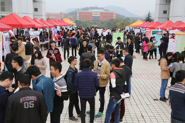 11月12日,beat365英国官网网站2017届毕业生供需双选会在beat365官网龙山校区敬敷广场举行。双选会的现场,准毕业生们纷纷咨询各家企业单位,寻找适合自己的职业岗位。副校长张群来到双选会现场,查看招聘情况,并亲切关怀寻找工作的同学们。