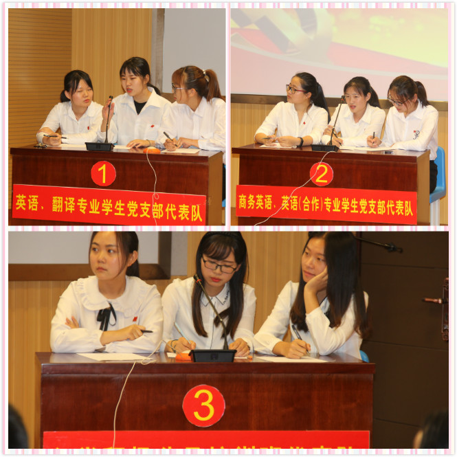 本次竞赛设有党章学习心得英文演讲和双语党章知识竞赛两个环节。在首先进行的党章学习心得演讲中,5名参赛选手结合制作精美的幻灯片,立足自身经历,回顾自己入党的点滴,以点带面,以小见大,向评委和观众展示了他们积极向上、乐于奉献、一心向党的热情。来自14级英语1班的张文俊同学分享了自己西藏之行的经历,结合图片展示了西藏自和平解放以来在党的领导下发生的翻天覆地的变化。她对党的民族政策的精彩陈述和她立志投身于志愿者工作的决心深深地感染了在场观众。最终,她的表现也得到了评委的一致认可,斩获了演讲组的桂冠。随后进行的双语党章知识竞赛对2012年修订通过的《中国共产党章程》(中英双语版)进行考查,分为必答和抢答两个环节,采用选择题、正误判断题和问答题等多种形式,内容涵盖党史、党内各项规定,廉洁自律准则、纪律处分条例等多方面知识。来自英语和翻译学生党支部代表队,商务、英语(合作)学生党支部代表队,入党积极分子培训班代表队3个代表队的9名同学参与了紧张又充满趣味的角逐。参赛选手个个理论功底扎实,反应能力迅速,赢得现场观众的阵阵掌声。经过激烈的角逐,由曹琛、储敏、王婧组成的第55期入党积极分子培训班代表队获得了“最佳团队”的殊荣。