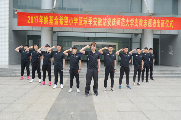 5月2日下午, 2017年姚基金希望小学篮球季安徽站beat365英国官网网站志愿者出征仪式在beat365官网体育馆举行。副校长、校体艺委主任张群出席仪式并讲话,安徽省青基会理事长、希望工程办公室主任曹勇、安徽省希望工程办公室李辉、体育学院党政领导、校团委相关工作负责老师、本次支教工作的指导老师和11名支教志愿者参加了出征仪式。