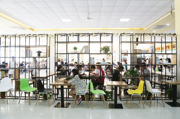 多功能区四周用铁艺书架等进行围合,设置了六边形的卡座,卡座中间还种植了一棵树,周围分布着多肉植物和绿植。“食堂设计得这么好,我感觉以后点外卖的次数都会少很多。”地理科学专业2017级的李小红说。