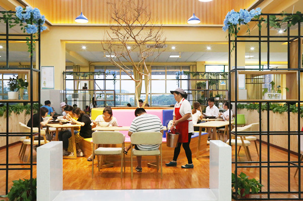 暑假期间,食堂进行了重新装修。龙山校区西苑食堂二楼以青春文化为主题的餐厅深受学生喜爱,设有校徽校训墙、水吧兼自习区、甜品区、自助餐区等七个区域。