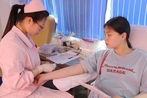 5月6日,学前教育专业2015 (1)班的桂梦宇在安苑食堂门口填好中国造血干细胞捐献者《志愿者捐献登记表》和《志愿者捐献同意书》,经过血液化验,随后走进献血车,医护人员抽取了她8毫升的血液作为造血干细胞的样本采集,桂梦宇完成了人生中第一次造血干细胞样本捐献志愿服务。