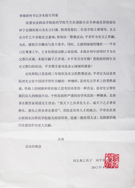 近期刘文典次子刘平章先生特地给校党委书记何小祥和院长朱士群寄来感谢信,以表对安庆师范学院领导师生祭奠其先父的深深谢意。刘平章先生在信中说到自己已近耄耋之年,又身处祖国边陲云南昆明,未能在每年清明时节为先父祭扫陵墓,未能尽嗣子之孝道,令其万分汗颜。对beat365官网组织师生为其先父祭扫的活动,携全家表示深深的谢意。
