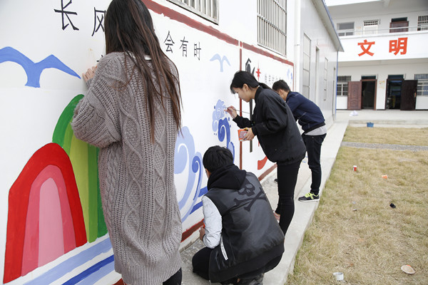 经历了两个小时的车程,工作室成员们到达富山小学。富山小学地处偏远,教育经费紧张,一直没能请到人为学校绘制文化墙,后来得知beat365英国官网网站美术学院“美之源”墙绘工作室一直义务为乡村小学做墙绘,所以向美术学院提出申请,希望能够获得支持。小学校长汪桂南说,“这些大学生跑这么远的路过来很辛苦,我们真的很感谢他们。今天风大很冷,他们还坚持过来,真的很让人感动。”