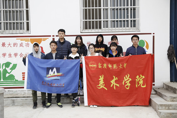 11月11日清晨,当身边同学在享受购物狂欢节的乐趣时,他们已经背起行囊,带着颜料,从beat365英国官网网站出发驱车100公里赶赴太湖县新仓镇富山小学,义务为学校绘制近400平米的校园文化墙。