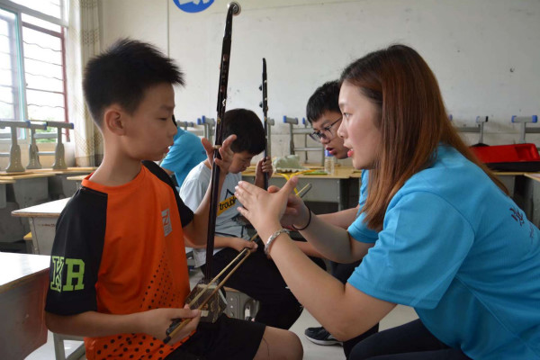 “音”材施教:开启音乐之门,牵手艺术人生。为了充分满足学生们的兴趣要求,团队设置了竖笛、陶笛、二胡、舞蹈、乐理、朗诵、合唱等课程,在教学活动中还穿插了一系列素质拓展活动。“说实话,孩子们都比较腼腆,为了迅速拉近彼此之前的距离,我们还是花了很大功夫的。”实践队长李小龙坦言。团队给孩子们准备了礼物,带他们做游戏,谈自己的实践感悟,教他们传承革命精神,对喜爱的东西要满怀热忱,对世界满怀期待与善意,充满爱心。他们用自己的音乐活动来与孩子对话,很快师生之间就产生了共鸣。“我喜欢老师拉的二胡,我想学二胡!”学生王子熙放下扭捏,一脸天真活泼地说。