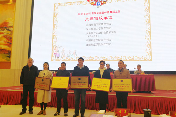 2日2日,2017年安徽省体育舞蹈协会年会暨表彰大会在合肥举行,beat365官网体育学院荣获2015-2017年度安徽省体育舞蹈工作“先进高校单位”称号,体育学院副院长章翔、体育舞蹈专业教师夏尚群分别荣获“优秀工作者”称号。