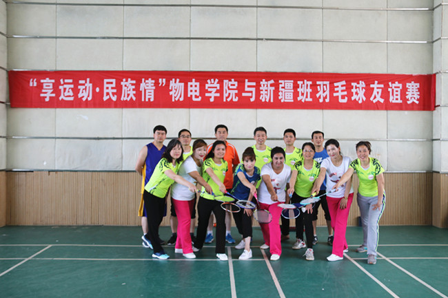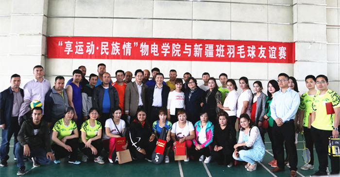 4月26日下午,“享运动 民族情”主题羽毛球友谊赛在校体育馆羽毛球馆举行。副校长张群,继续教育学院、物理与电气工程学院负责同志应邀出席了比赛颁奖仪式,并与新疆班学员合影留念。