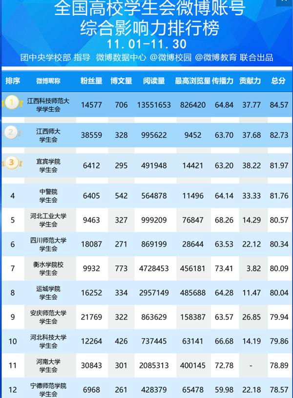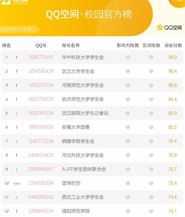 “全国高校学生会微博帐号综合影响力排行榜”是团中央学校部为促进高校学生会新媒体工作的相互借鉴、共同发展,对各级学联、学生会组织新媒体平台进行综合排名的榜单。该榜单通过博文量、阅读量、最高阅读量、传播力、贡献力等角度全方位呈现了全国高校学生会组织微博的运营情况,具有很强的权威性与参考价值。目前,腾讯QQ空间月活动用户数6.5亿,校园空间已拥有1115所大学入驻,覆盖多达986万活跃学生,每月通过影响力指数和互动指数等指标对QQ校园空间进行客观综合评分。