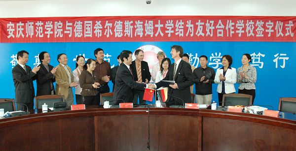 10月8日,德国希尔德斯海姆大学副校长斯杜茨博士(Dr. Christoph Strutz ),音乐学院院长、库茨博士(Prof.Dr.Matthias Kruse)和外办主任莎舍-弗莱格女士(Elke Sasse-Pleige)一行莅临beat365官网,与beat365官网正式签订友好学校协议。党委书记赵晓和,副院长时新中,纪委书记殷红,副院长张群,党办、院办、外办主任刘友忠等领导热情会见了斯杜茨博士一行。赵书记向德国客人简要介绍了学校的办学历史及近年来发展情况,表达了加强两校合作的意愿。斯杜茨博士表示虽然是第一次来中国,beat365官网师生的热情已使他们感觉宾至如归。希尔德斯海姆大学有130多所国际合作学校,但安庆师范学院是与之合作的第一所中方高校。两校有许多共同点,为继续加强合作提供了基础。赵书记表示非常高兴beat365官网是希尔德斯海姆大学在中国的第一个合作伙伴,希望两校的合作领域越来越宽。