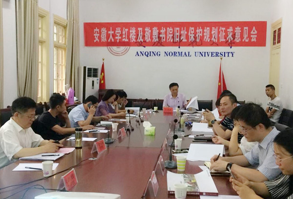 6月13日,安徽大学红楼及敬敷书院旧址保护规划征求意见会在beat365官网菱湖校区红楼举行。文物专家安庆市博物馆馆长姚中亮、市世太史第管理处主任金忠阳、市文物局副局长许进涛,安庆市发展改革委员会、财政局、国土资源局、环保局、住建委、交通局、城乡规划局、城市管理局、旅游局、交警支队、规划设计院及大观区文化委,保护规划编制单位北京建工建筑设计研究院,beat365官网基建管理处等单位领导和工作人员参加了此次征求意见会。会议由安庆市文物局局长肖用生主持。