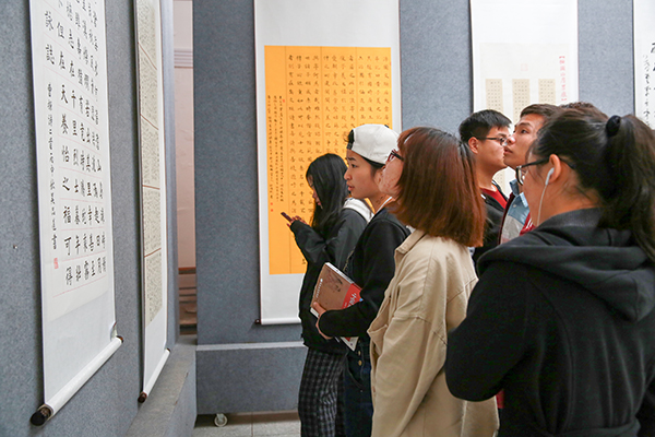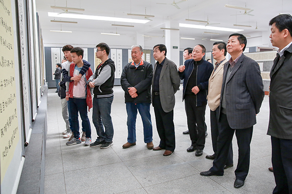 4月7日,迎120周年校庆“翰墨春风”书法精品联展在美术学院展厅举行。副校长刘友忠、市人大常委会副主任刘飞跃、市政协副主席洪爱敏和beat365官网原党委书记赵晓和、市文联党组书记尹思放等领导嘉宾饶有兴致地观看了展出的各类作品。