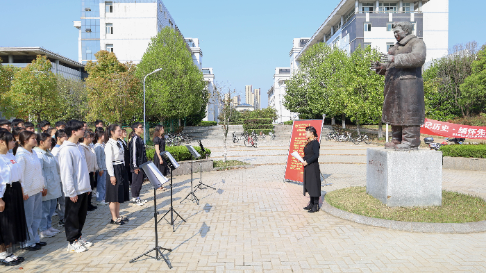 “在这充满情感的日子,我们身为‘稼先青年’,又该以怎样的方式传承精神寄托我们的哀思?”陈银凤引导在场学生思考中国青年的时代定位、明确中国青年的时代担当与责任,回顾了邓稼先立志报国、以身许国的生命历程,学生们凝视着雕像,认真聆听,思考……