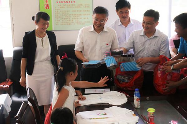 8月2日上午,校长闵永新在团委负责同志和大龙山镇党委书记邓建群等陪同下,冒着烈日酷暑前往大龙山镇桃元社区,亲切慰问校学生会“启明星”关爱留守儿童暑期实践服务团队,并向社区的小学生们赠送了学习用品。