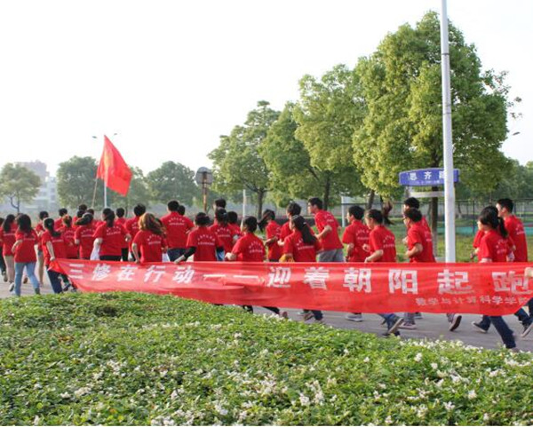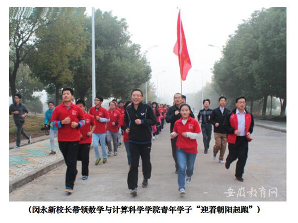 二是“伴着晨曦早读,迎着朝阳起跑”让学生体魄更健康。为了有效避免学生睡觉晚、起床迟、迟到多、不吃早餐的不健康学习和生活状态,响应团中央青年学生要“走出宿舍,走下网络,走向操场”的号召,配合“文明从我做起,课堂拒绝手机”活动的开展,2014年3月,学院在全体一二年级学生中开展了“迎着朝阳起跑”活动。活动上半年从3月底到6月中旬,下半年从9月中旬12月中旬,每天早晨组织学生跑步半小时,1.5公里。为了提高学生的积极性和参与度,学院在综合测评中把阳光晨跑引入了体育方面的加分,保障了活动的顺利持续开展。活动开展后,很快就在学校产生了一定的积极影响,2014年10月23日,校团委在数学与计算科学学院“迎着朝阳起跑”中启动了全校的“三走”活动,闵永新校长也亲自和同学们一起迎着朝阳奔跑。(数学与计算科学学院党总支)