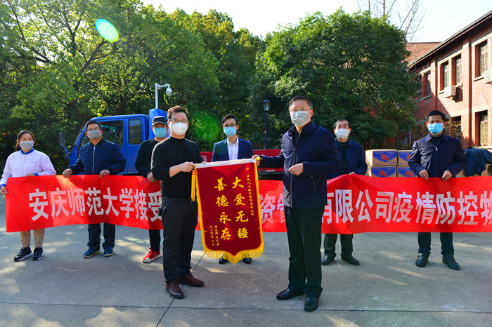 闵永新代表学校向李正赠送了锦旗,对安徽九点投资管理有限公司的爱心之举表示感谢。他指出,在这万众一心、共抗疫情的危急时刻,安徽九点投资管理有限公司心系教育、心怀感恩、慷慨捐赠的善举,将会更加凝聚安庆师大的向心力,增强学校战胜疫情的决心和信心。相信在中央、省委和省委教育工委的领导下,在全校广大师生和社会各界的共同努力下,一定能打赢这场疫情防控阻击战。