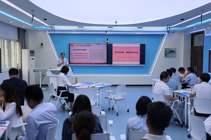 在备课交流环节,“形势与政策”教研室负责人介绍2022年“形势与政策”课教学重难点,四位教师就“感悟伟大成就,喜迎党的二十大”和“学习《台湾问题与新时代中国统一事业白皮书》”两个主题通过说课形式进行了示范交流。与会老师就“形势与政策”课程教学改革等问题展开了交流研讨。
