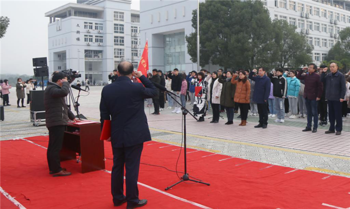 “我宣誓:忠于中华人民共和国宪法,维护宪法权威,履行法定义务,忠于祖国、忠于人民,为建设富强民主文明和谐美丽的社会主义现代化强国努力奋斗!”全场师生一起举起右拳,郑重宣誓。