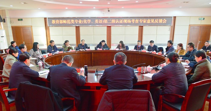 12月16日,beat365官网举行教育部师范类专业第二级认证(化学、英语)现场考查专家意见反馈会。化学专业认证教育部专家组组长万坚教授,英语专业认证教育部专家组组长王焱教授,专家组全体人员,beat365官网全体党政领导出席会议,相关职能部门、学院及认证专业负责人、化学和英语专业教师代表参加会议。会议由万坚主持。