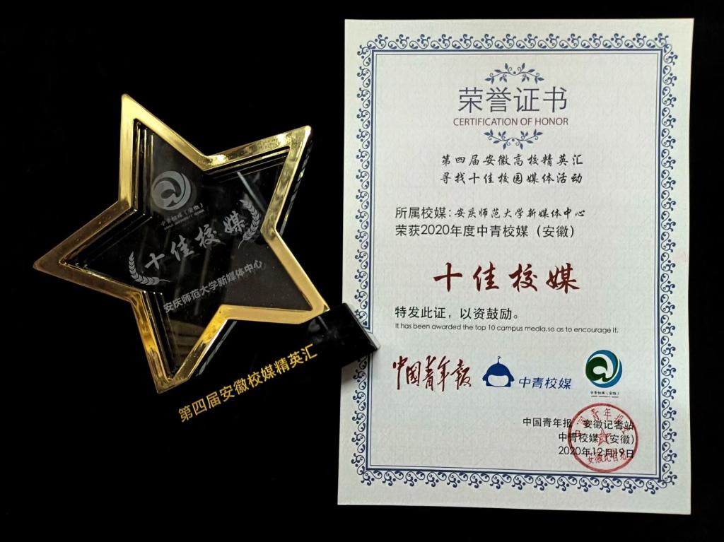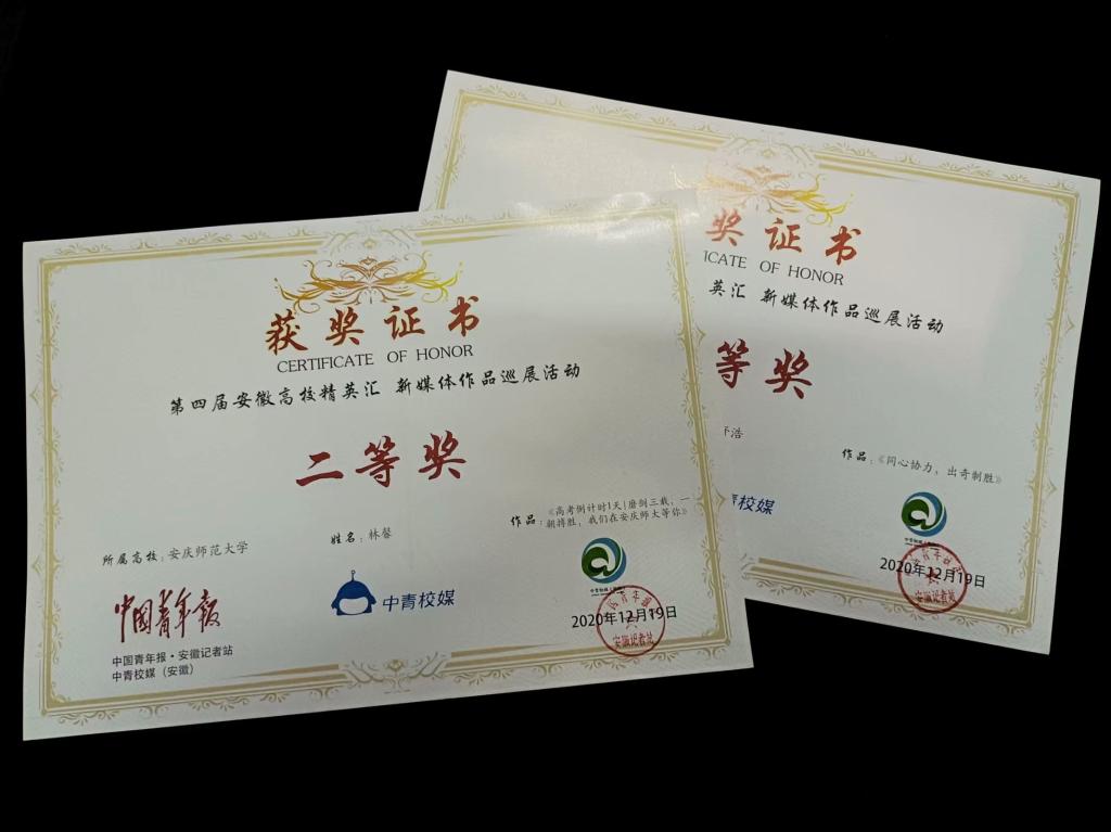 在第四届安徽校媒精英汇暨校园新媒体交流论坛中,校新媒体中心获得2019-2020年度安徽省“十佳校媒”称号;林馨的原创作品《高考倒计时一天|磨剑三载,一朝搏胜,我们在安庆师大等你》荣获微创意作品二等奖;程舒浩的原创作品《同心协力,出奇制胜》获得微漫画作品三等奖。
