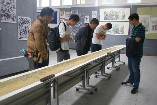 画展吸引了众多老师和学生,美术学院环境设计专业2013级的的王蓉在细细观赏完所有的美术作品后表示:“令我印象最深刻的是这幅《千里江山》,这幅画笔法细腻,细节方面处理得也特别好,山峰的晕染,黄色铺底,画面感特别好,呈现出一种很浓韵的感觉。”这幅《千里江山》是在绢上绘就的,描绘了连绵的群山岗峦和浩淼的江河湖水,山岭、坡岸中点缀着亭台楼阁、茅居村舍,水磨长桥,飞鸟共天之景让人不舍移目。其描绘精细,意态生动,整个画卷长达9.5m,宽50cm。美术学院的江老师也感叹,“自我们院1991年开始办毕业生画展,这是二十几年来学生作品中最宏伟大气的一幅,也特别有意境感。看得出这名学生付出了很大的心血。”
