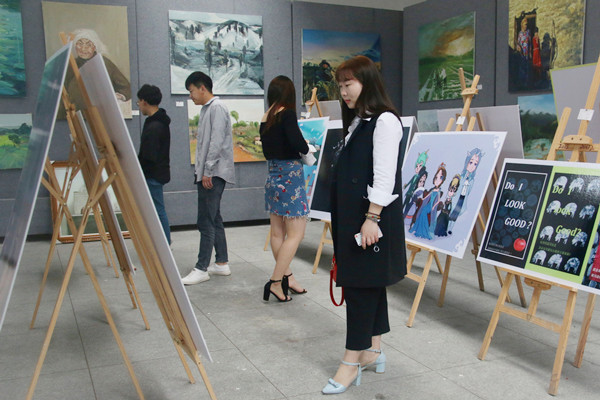 各种类型的中国画,色彩浓淡皆别有韵味;黑白鲜明冲击感强烈的雕版画,或花旦、或工民、或儿童,形象各异;厚厚颜料涂抹的油画,有的风格清新,有的凝重端庄。除此之外,还有很多水粉画,动漫手绘,电脑动画设计,手机APP设计图。