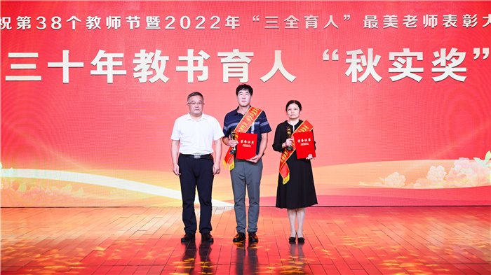校党委常委、副校长刘友忠宣读了表彰决定。三十年教书育人“秋实奖”获得者方晓珍、张孝民,“教书育人”最美老师王红、王翠萍、安民兵、周葆华、郭畅,“辅导员年度人物”易惠、孟莉,“科研育人”最美老师张晓可、崔汪卫,“管理育人”最美老师王先荣、陈广,“服务育人”最美员工王丰收、刘永峰等15位老师在会上受到表彰,校领导为所有获奖教师和教育工作者颁发奖杯和荣誉证书。