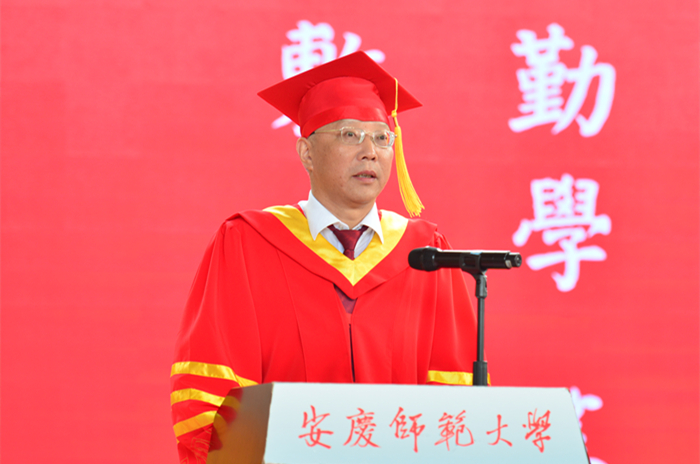 闵永新代表学校向全体毕业生致以最热烈的祝贺,向辛勤培育同学们的父母和老师致以衷心的感谢。闵永新表示,2021年是中国共产党成立一百周年,在这样一个特殊时刻,同学们的毕业显得更加意义非凡。“作为与百年相遇、与时代同行的一代人,你们都是实现第一个百年奋斗目标的见证者,也是实现第二个百年奋斗目标的建设者,既有大展宏图的舞台,也肩负着更为艰巨的责任使命。”闵永新带领在场师生重温了习近平总书记的重要论述,从“立大志、明大德、成大才、担大任”四个方面提出殷切希望和要求,他希望同学们能够铭记在安庆师大汲取的人文灵韵,永葆“敬敷、世范、勤学、笃行”的师大精神,存敬敷之心,养世范之德,立勤学之志,走笃行之路。